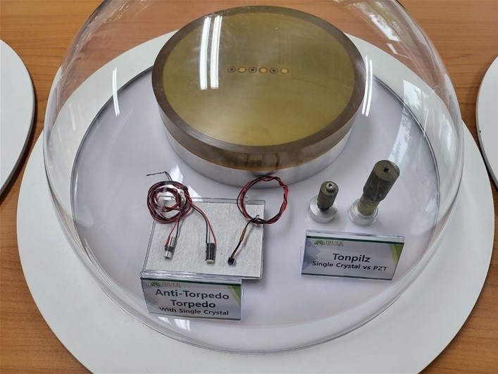 압전단결정 음향센서 (지름 400, 높이 300 반구형) 주요기능: 음향신호를 전기적 신호 또는 전기적 신호를 음향신호로 변환 기능 - 압전 단결정 소재의 소나센서 응용에서의 가장 큰 장점으로는 높은 압전상수와 낮은 탄성계수의 물성치로 인해 고효율, 고출력, 광대역의 음향성능 뿐만 아니라 기구적으로 소형화 및 경량화가 가능함. - 하나의 센서를 통해 좀 더 넓은 주파수의 이용이 가능하므로 음향센서의 크기와 수를 줄일 수 있어 잠수함이나 함정의 운용효과와 효율을 증대시킬 수 있음. |